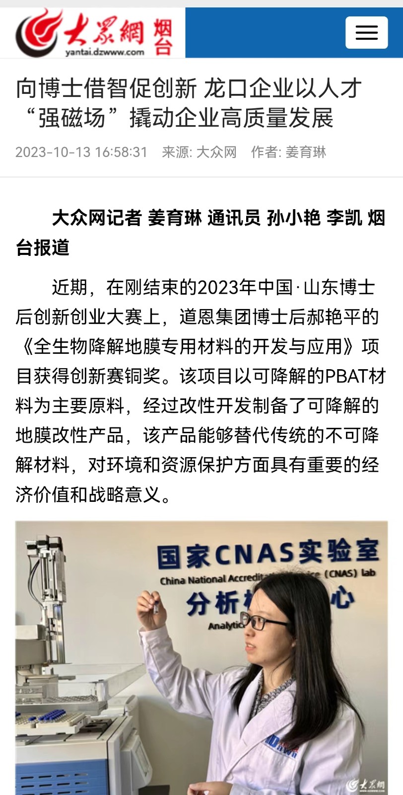´ËǰµÄ9ÔÂ18ÈÕ£¬ £¬£¬£¬£¬2023ÄêÖйú·É½¶«²©Ê¿ºóÁ¢Òì´´Òµ´óÈü°ä½±ÒÇʽÔÚɽ¶«Ê¡ÇൺÊоÙÐС£¡£ ¡£¡£¡£¡£PAÆì½¢Ìü¡¤(Öйú)¹Ù·½ÍøÕ¾ÔÚÕ¾²©Ê¿ºóºÂÑÞÆ½Õ¾ÉÏÁËÁ콱̨£¬ £¬£¬£¬£¬ËýÖ÷³ÖµÄ“È«ÉúÎï½µ½âµØÄ¤×¨ÓÃÖÊÁϵĿª·¢ÓëÓ¦ÓÔÏîÄ¿»ñµÃÁËÁ¢ÒìÈüÍ­½±¡£¡£ ¡£¡£¡£¡£¾ÝϤ£¬ £¬£¬£¬£¬ÕâÊÇÁú¿ÚÊÐΨһ»ñ½±µÄ²©Ê¿ºóÊÂÇéÕ¾ÏîÄ¿¡£¡£ ¡£¡£¡£¡£