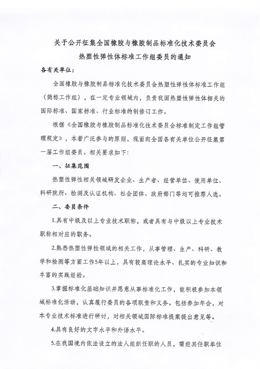 凭证《天下橡胶与橡胶制品标准化手艺委员会标准制订事情组治理划定》,,,,,,,,本着普遍加入的原则,,,,,,,,现面向天下各有关单位果真征集第一届事情组委员。。。。。。。。相关要求如下: