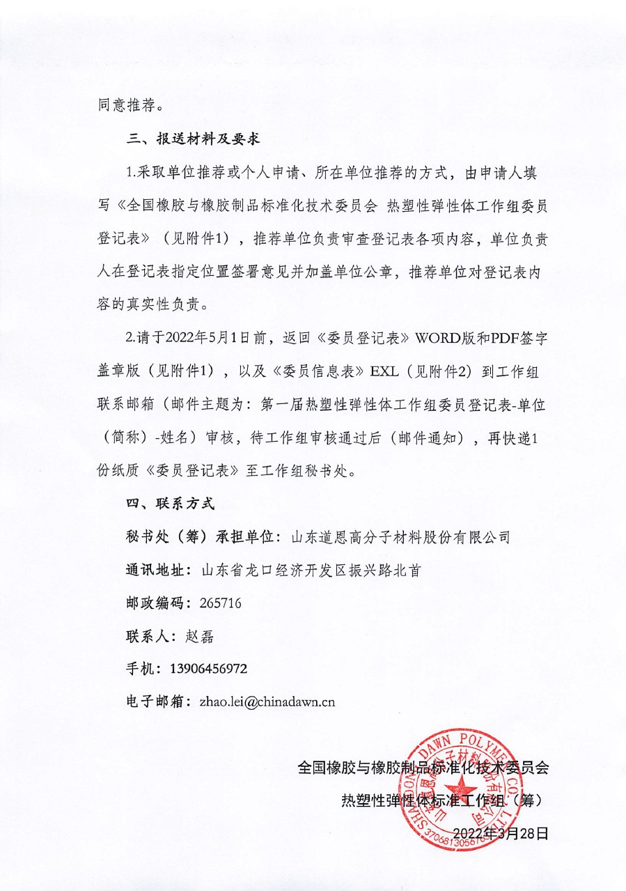 2.请于2022年5月1日前,,,,,,,,返回《委员挂号表》WORD版和PDF签字盖章版(见附件1),,,,,,,,以及《委员信息表》EXL(见附件2)到事情组联系邮箱(邮件主题为:第一届热塑性弹性体事情组委员挂号表-单位(简称)-姓名)审核,,,,,,,,待事情组审核通事后(邮件通知),,,,,,,,再快递1份纸质《委员挂号表》至事情组秘书处。。。。。。。。